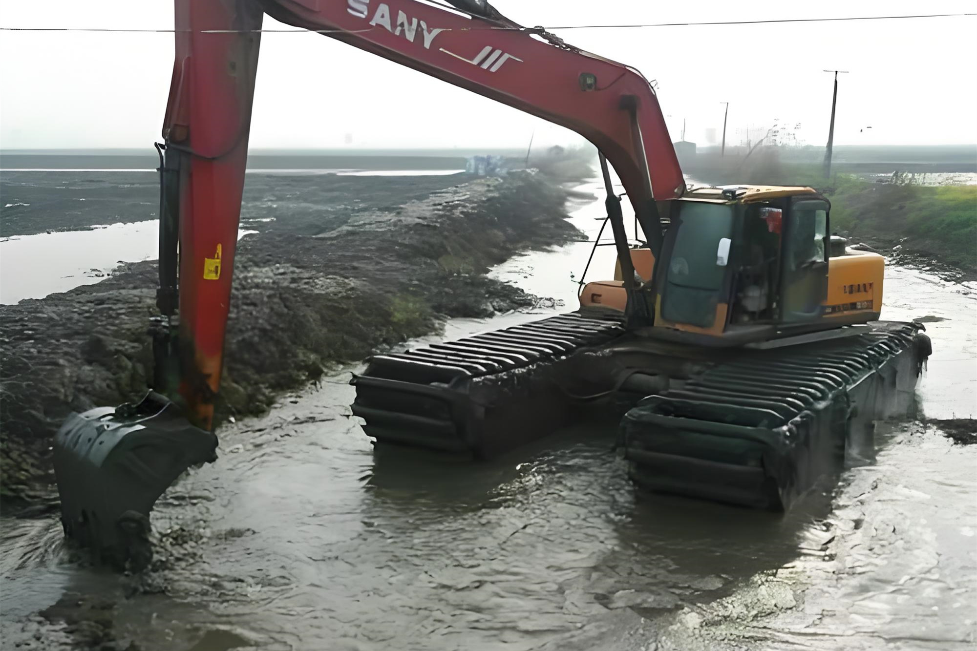 而小型水上挖機剛好能解決這個問題:機身寬度 3-4 米,剛好能在 5 米寬的河道里掉頭;采用 “淺水域浮臺 + 履帶” 設計,水深 0.3 米就能浮起作業,就算河道局部有淺灘(水深 0.2 米),也能通過履帶緩慢移動,不會陷進淤泥或壓塌河坡。比如玉門清泉鄉某 5 米寬的灌溉渠,用小型水上挖機清淤時,一天能推進 150-200 米,全程沒出現卡殼、壓坡的情況,比人工清淤效率高 5 倍以上。